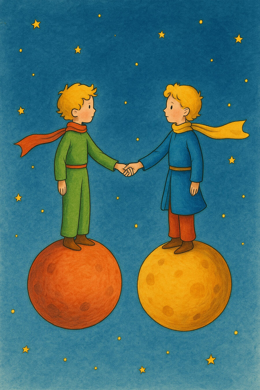 The Little Prince, standing on his small planet, facing away from me, staring at the horizon.